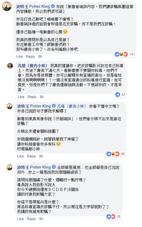 不過波特王仍不甘示弱,留言反擊廣告小妹的論點不合邏輯,「你在打自己臉吧?啪啪響不痛嗎?臉書端詳過的話就會知道是在反詐騙,而不是我們在詐騙。」,他也怒嗆廣告小妹「我真的想問你是以為自己是誰?你在臉書工作嗎?跟臉書很熟?別叫廣告小妹了,改名叫編劇小妹吧」、「你就繼續跳針,跳著跳著就下神壇了」,認為廣告小妹的分析全是自己腦補,這次雙方你來我往地互槓,也引起其他網友的論戰,蔚為話題,不過究竟真相為何,恐怕還得等臉書親自說明。