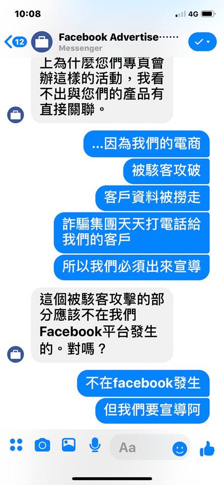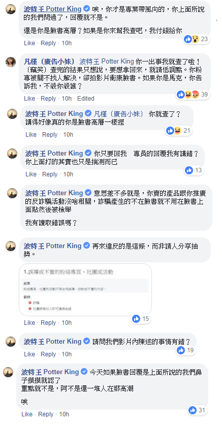 而這則貼文,也釣出了波特王出來留言,他氣憤表示「唉,你才是專業帶風向的,你上面所說的我們問過了,回覆就不是。」同時貼出和臉書專員的對話,「意思差不多就是,你賣的產品跟你推廣的反詐騙活動沒啥相關,詐騙產生的不在臉書就不用在臉書上面貼然後被檢舉」,波特王一口氣留了超多則留言,廣告小妹則是另闢戰場,又PO出一則貼文。