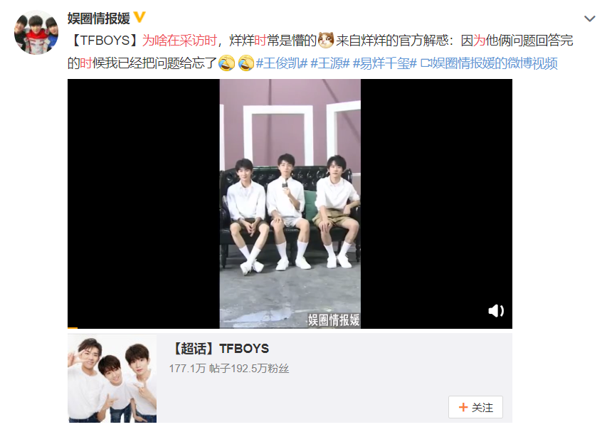 易烊千璽本人也親自回答,可愛的答案也超乎記者的想像,他靦腆的笑著表示「剛剛他們倆(王俊凱與王源)回答之後,我想了自己的答案,結果就忘了問題是什麼」,可愛的表現也讓網友看到後覺得易烊千璽的個性十分單純,而這也與TFBOYS一直以來深受粉絲喜愛的特質相符,未來三人的動態也十分令網友期待。