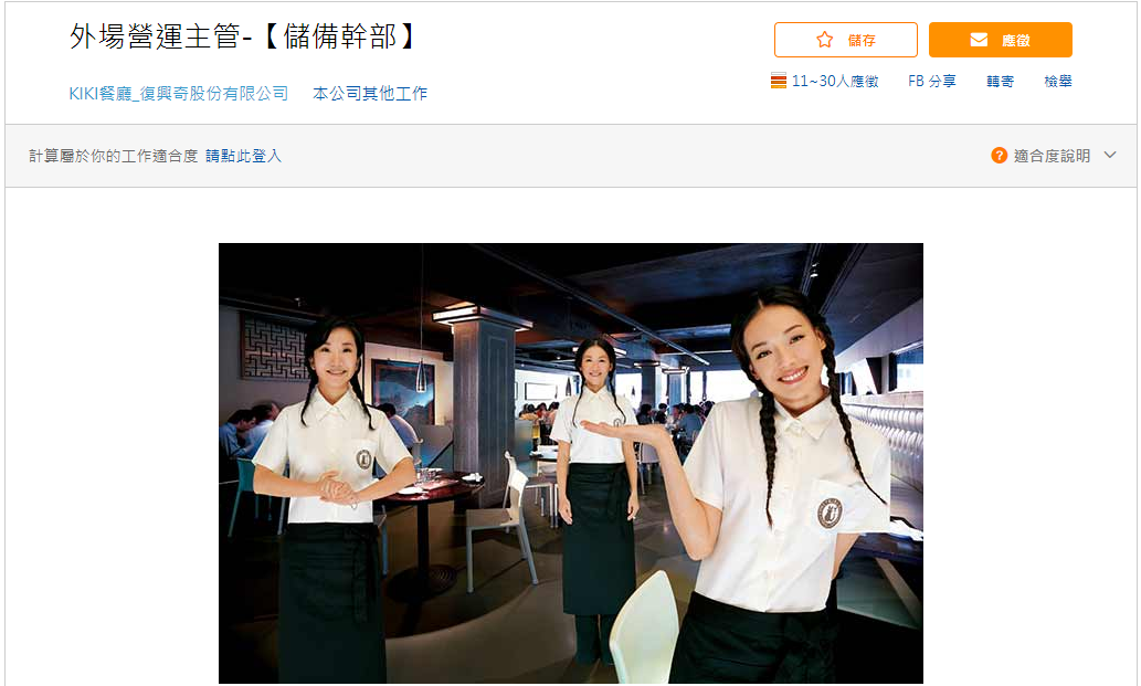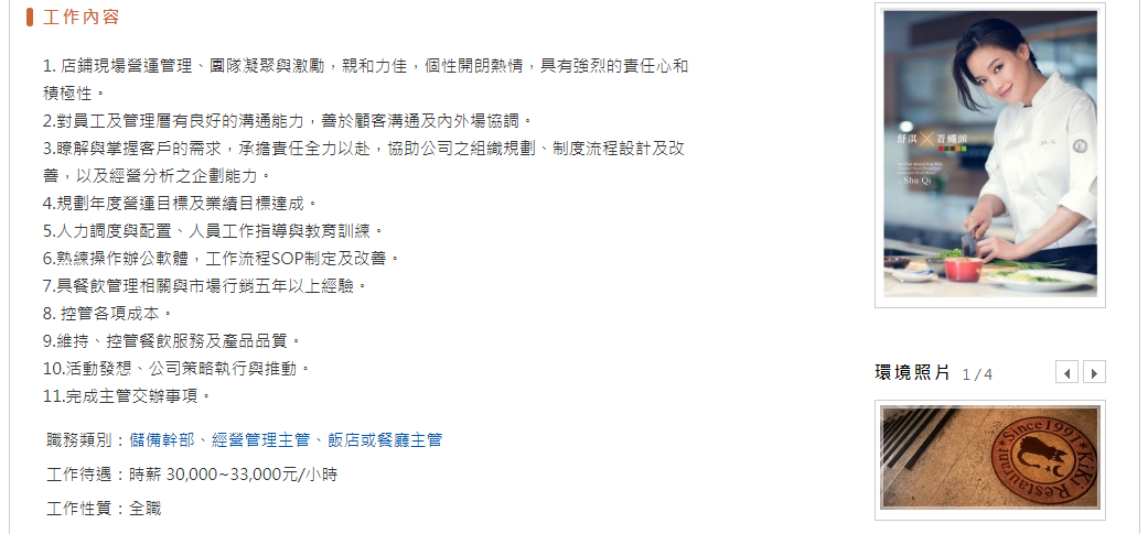 KiKi餐廳復興店今(3)日在104人力銀行PO出徵人啟事,要應徵一位外場營運的儲備幹部,主要要負責店鋪的現場營運、規劃年度目標、人員教育訓練、活動發想等等,不過工作待遇的部分疑似不小心將月薪寫成時薪,寫著「時薪 30000~33000元/小時」,讓網友看傻眼忍不住笑說:「大家在等甚麼呢?這麼高的時薪還不快報名,說不定還能跟舒淇上班呢~」