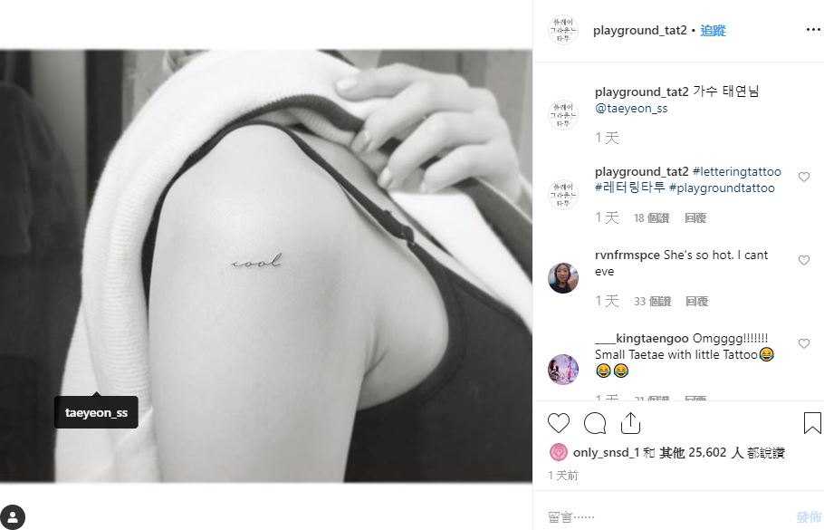 2日,一間韓國刺青店「Playground」在官方IG公開了太妍的刺青,並在貼文中標記太妍本人的官方IG,而照片中,太妍的最新刺青就在右手的上手臂處,並留有草寫英文單字「Cool」,雖然太妍本人沒有出面說明刺青的真正意思,不過有不少網友除盛讚太妍的刺青很性感,也猜測到「就算沒有刺青,太妍還是很酷」、「沒錯!這就是你的樣子」。