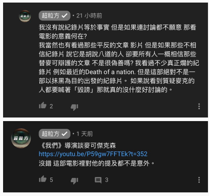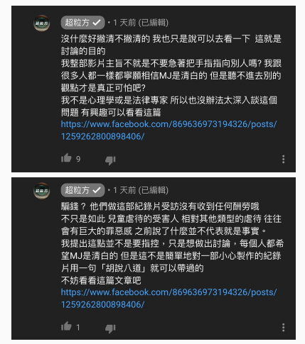 網友們紛紛提出超粒方推薦的紀錄片《離開夢幻莊園》諸多內容不實,並且會誤導大家的看法。而在諸多罵聲之中,超粒方則回應「我跟很多人都一樣寧願去相信MJ是清白的,但聽不進去別人的觀點才是真正可怕吧?」,並且強調自己只是想跟大家討論,「如果連討論都不願意,那看電影的意義何在?」。