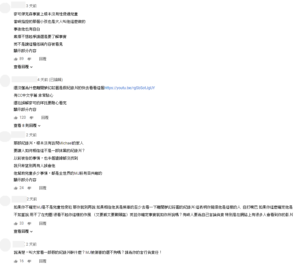 超粒方在影片中接著表示:「但是說真的,如果你相信他是完全無辜的,至少去一下《離開夢幻莊園》這系列紀錄片」,這句話讓許多網友看了相當不滿,紛紛留言說道:「麥可傑克森事實上根本沒有性侵過兒童,不想起爭議還是要了解事實 而不是讓這種低端內容被看見」、「搞清楚事實在說話,公眾人物請不要誤導大眾!」、「遠離夢幻莊園這部紀錄片純粹就是個陰謀」。