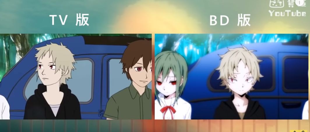 動畫《目隱都市的演繹者》的第九話,TV版本跟藍光的BD版本讓人看得相當訝異,兩者畫面都一樣,但看到TV版的人物顯現相當樸素,但BD版的猶如美肌、優化,兩者對比讓許多粉絲直呼「根本換角色」,讓粉絲說不敢直視TV版的人物,也笑說:「這是實驗失敗作品吧!」,BD版的風格太好看,同時也讓網友開玩笑的說,這是同一部作品嗎?