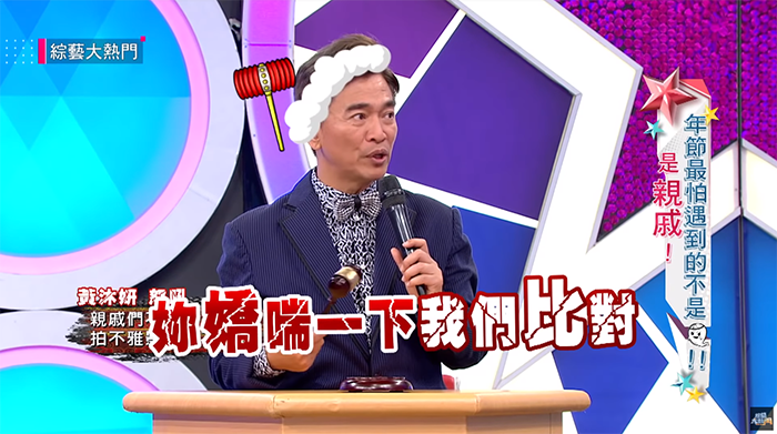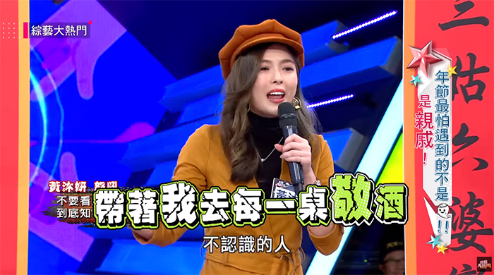 當藝人碰上一些頭痛親戚實在很困擾,小豬透露,她自己對唱歌很不擅長,但只要看到舞台,她就會被拉上去唱;且她也非常害怕去親戚的婚禮,「明明就是你們家小孩結婚,為什麼要帶著我去每一桌敬酒?!」但吳宗憲透露,看到藝人難免都會想拉一點關係,「是想跟我們親近一下,這個原諒他啦!」