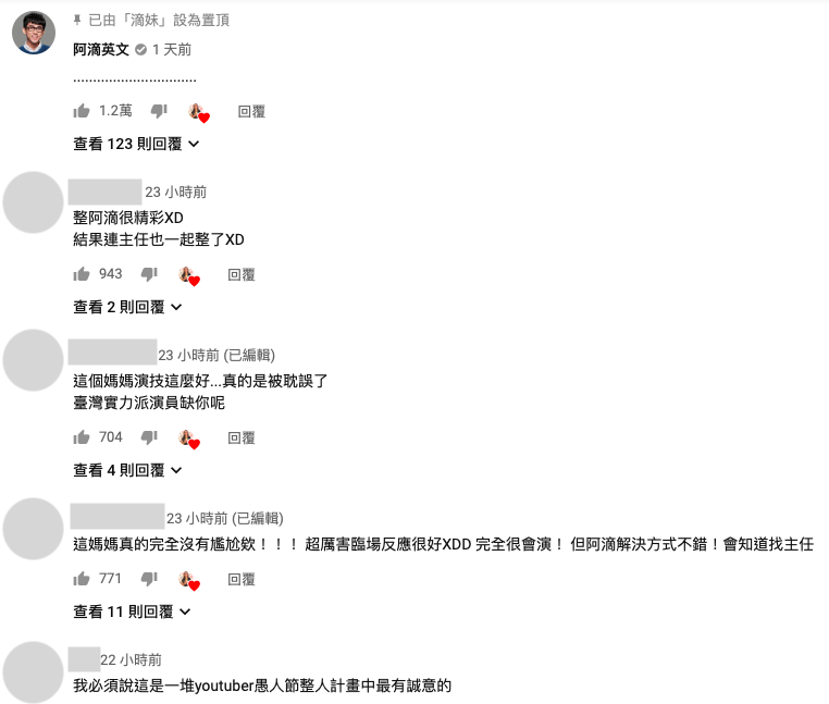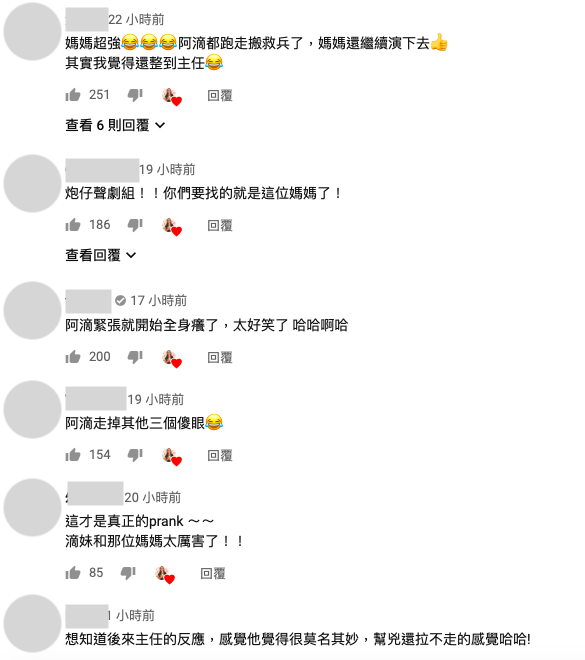 滴妹該影片底下留言紛紛表示:「媽媽太會演了!」、「主任也被整到了!」甚至有人搞笑表示:「炮仔聲劇組!你們要找的就是這位媽媽了!」、「更喜歡滴妹廢片。」可見得阿滴跟滴妹兩人都是惡整達人,不但會想梗,還會找演員,期待之後接下來的愚人節了(抖)。
