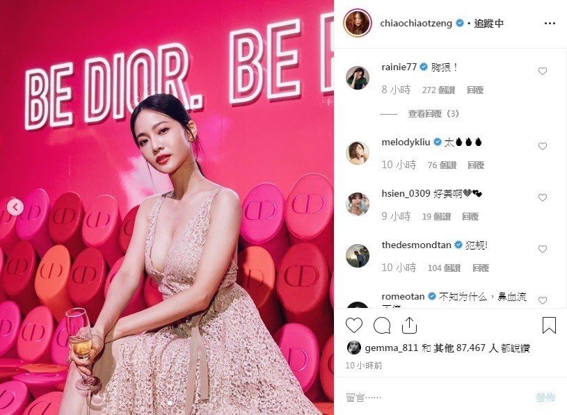 就連女星們看到此PO文,也留言直呼「太美!」楊丞琳更是誇獎「胸狠!」,簡潔有力的讚賞也吸引不少網友按讚。曾之喬當天參加新品發表現場,還有英國超模卡拉迪樂芬妮(Cara Delevingne)、南韓女星閔孝琳以及歌手宣美等人,IG留言也是「星光熠熠」。