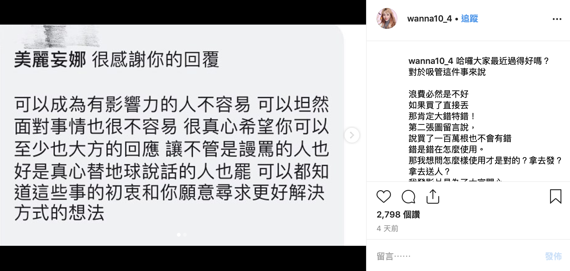 美麗妄娜表示自己一直以來拍片的初衷都是希望觀眾看了能夠開心,「也許使用吸管的方式不是100%正確,但每個物品不一定都是有固定的用處,物盡其用。其實過程中我也沒用到那麼多包,剩下沒用到的都還在公司。現在被大家認定惡意浪費,她也相當難過,更感嘆該買環保吸管。