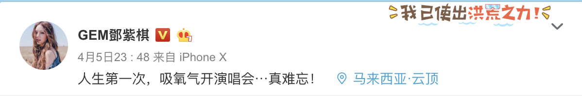鄧紫棋昨日晚間在馬來西亞雲頂高原的「雲頂雲星劇場」進行開唱,而該場地位於海拔1865米,相較過去的場地海拔算是非常高的地點,然而鄧紫棋演唱每一首歌曲都是盡全力帶來最佳表演,在此情況下非常容易缺氧,因此後台也特別準備了氧氣桶,她也在社群平台上發文寫下:「人生第一次,吸氧氣開演唱會…真難忘!」,並貼出她戴上氧氣罩吸取氧氣的照片。