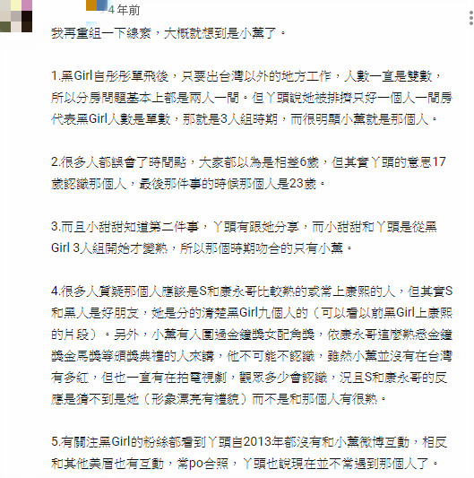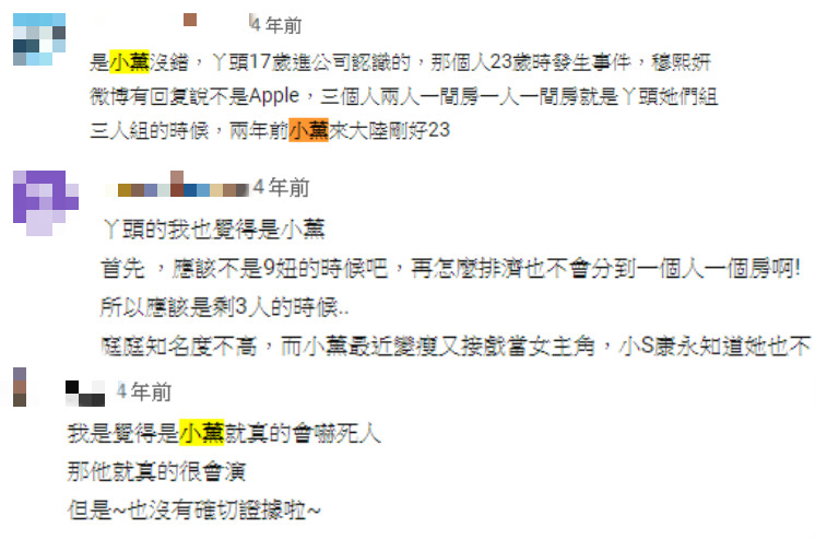 當時就有不少網友猜測,丫頭所爆料的對象就是小薰,有專業網友分析,當時黑Girl後期人數都是雙數,直到後來剩下小薰、丫頭及子庭,而還活躍在演藝圈中的僅剩下小薰,再加上丫頭的IG有追蹤其他人,就是沒有追蹤小薰,當時兩人也確實有到大陸一起主持節目,總總證據都將對象指向小薰;但也有部分網友認為,小薰平時都很真性情,不太像是她的作風。
