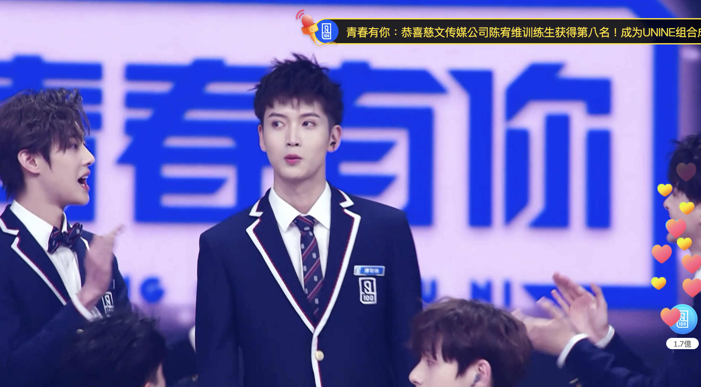 在今日晚間《青春有你》播出總決賽公演,正式出道的9人名單也正式出爐,團體名稱為UNINE,而排名第九到第一名依序為:何昶希、陳宥維、夏瀚宇、胡春楊、嘉羿、管櫟、姚明明、李振寧、李汶翰,然而NINE PERCENT作為第一屆的學長也在今日晚間到場支持,一起替《青春有你》劃下完美的句點。