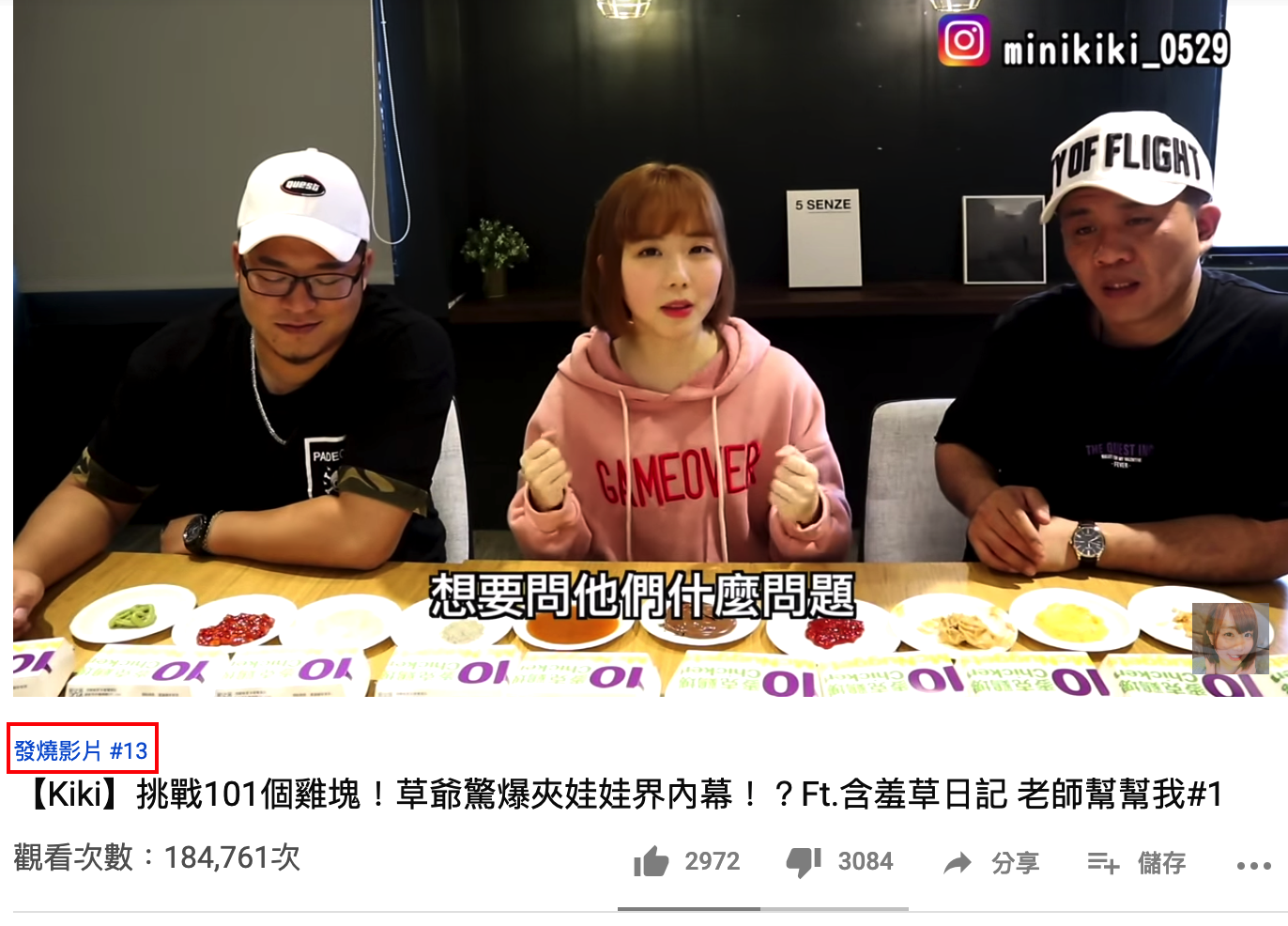3日Kiki發布新片《挑戰101個雞塊!草爺驚爆夾娃娃界內幕!?》,其中她和YouTuber草爺及超愛夾合作,挑戰吃101個沾不同醬料的雞塊,並在吃雞塊時,讓來賓回答她準備的辛辣問題。影片播出之後便直登YouTube發燒榜數日,還在短時間便累積18萬觀看次數,可見人氣相當高。