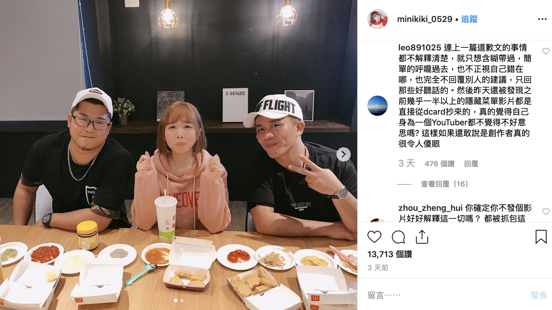 其實在Kiki的Ingstagram方面,也被湧入大批的網友留言,「連上一篇道歉文的事情都不解釋清楚,就只想含糊帶過」,認為她的道歉誠意不足。眼下抄襲風波延燒,不過無論是IG還是YouTube,Kiki都沒有多作回應。