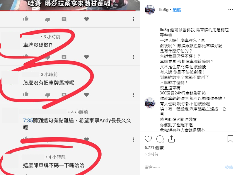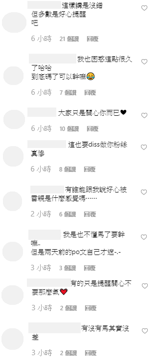 粉絲紛紛留言:「有的只是提醒關心不要那麼氣」、「大家只是關心你而已」、「有誰能跟我說好心被雷親是什麼感覺嗎⋯⋯」、「這也要diss做你粉絲真慘」、「這樣講是沒錯,但多數是好心提醒吧」、「基本上車牌可以找到姓名、電話、住址」、「公眾人物多少保護自己,誰知道會不會有狗宅隊跟拍」。