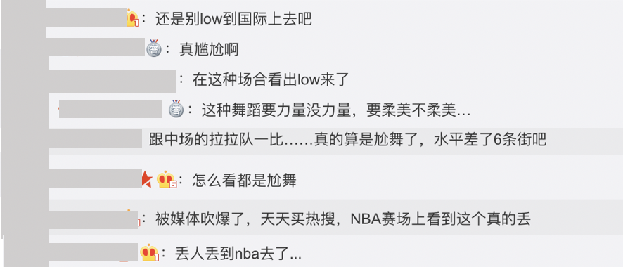 在今日早上,火箭少女也登上休士頓火箭隊主場進行演出,8人身上都穿著代表火箭隊的紅色配色,在舞台中間相當熱情與賣力的演出,然而影片在微博上傳開後卻引發網友不滿,認為她們的演出實力不足,紛紛留言:「被媒體吹爆了,天天買熱搜,NBA賽場上看到這個真的丟臉」、「怎麼看都是尬舞」、「這種舞蹈要力量沒力量,要柔美不柔美…」、「在這種場合看出low來了」、「真尷尬啊」