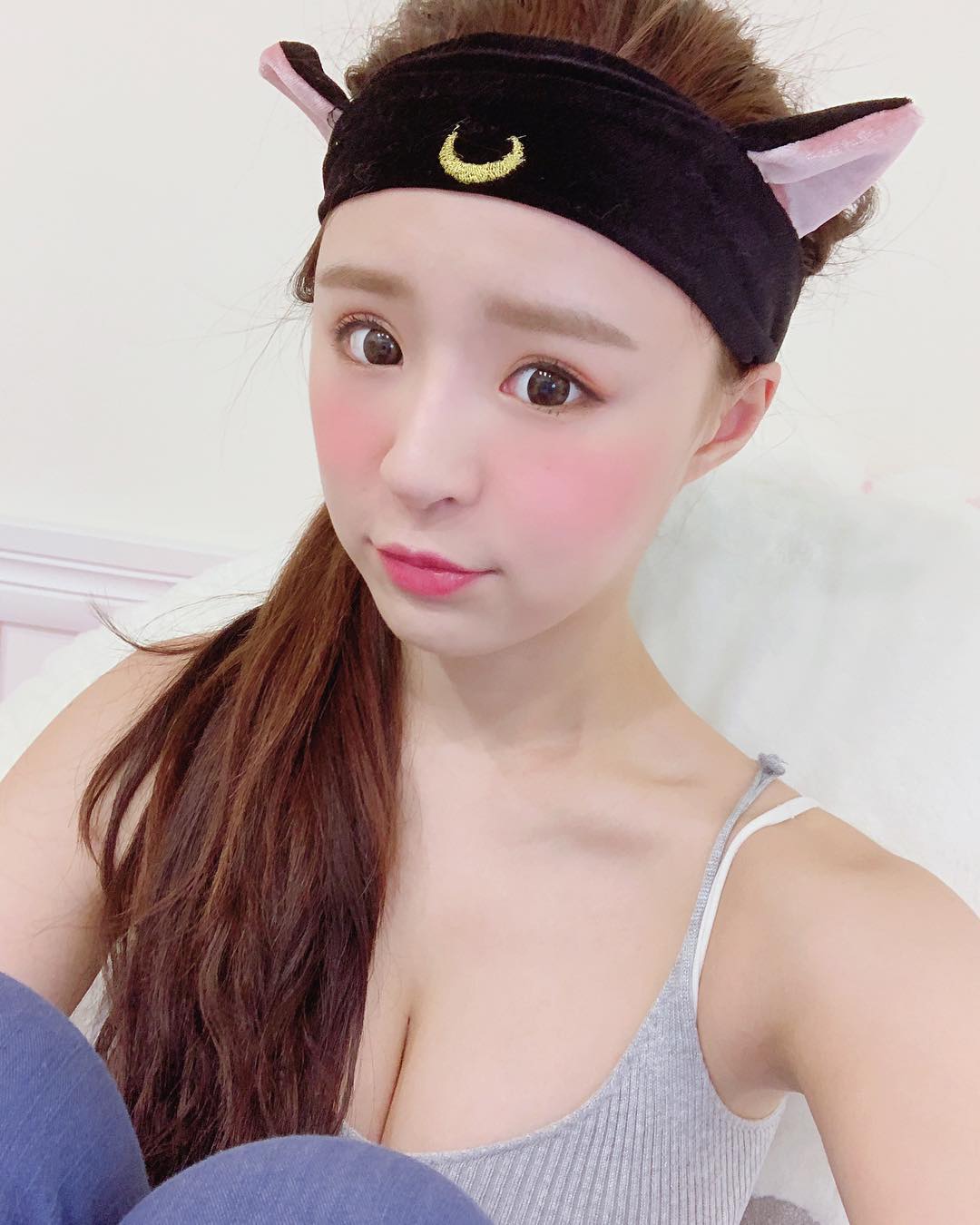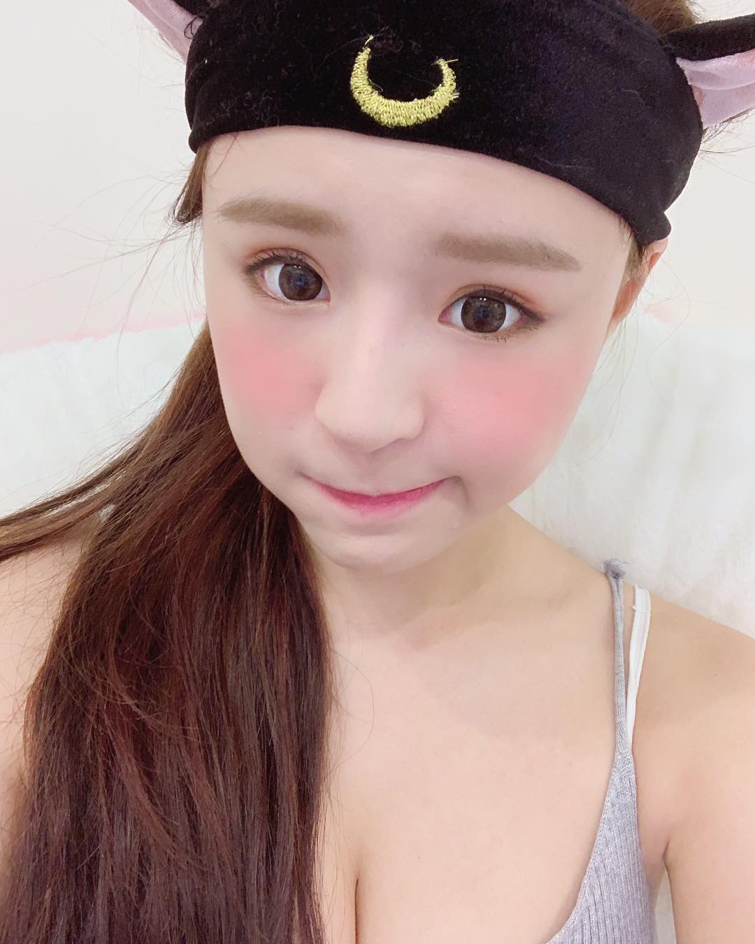 元元日前在IG曬出美照,只見他穿著灰色的細肩帶背心,超低胸的設計讓她豐滿的上圍呼之欲出,深邃的事業線也讓粉絲們大飽眼福。元元隨意的紮起馬尾,頭上還帶著一個美少女戰士造型的束髮帶,黑色的髮帶上有兩個俏皮的貓耳朵,中間還有個月亮的圖案,乍看之下跟包青天的打扮有幾分相似。