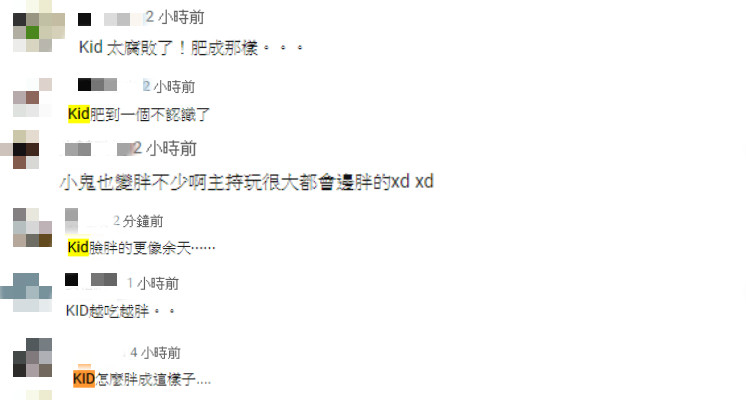 KID因接下《綜藝玩很大》的主持棒星路大開,人氣水漲船高,不過也因此替他帶來職業傷害,一口氣胖了25公斤,甚至被網友笑虧撞臉余天,不過他似乎並沒有減重的打算。在最新一集播出的《玩很大》中,網友發現KID似乎又胖了一大圈,整個臉腫成圓的,讓網友們看了忍不住酸:肥到一個不認識…