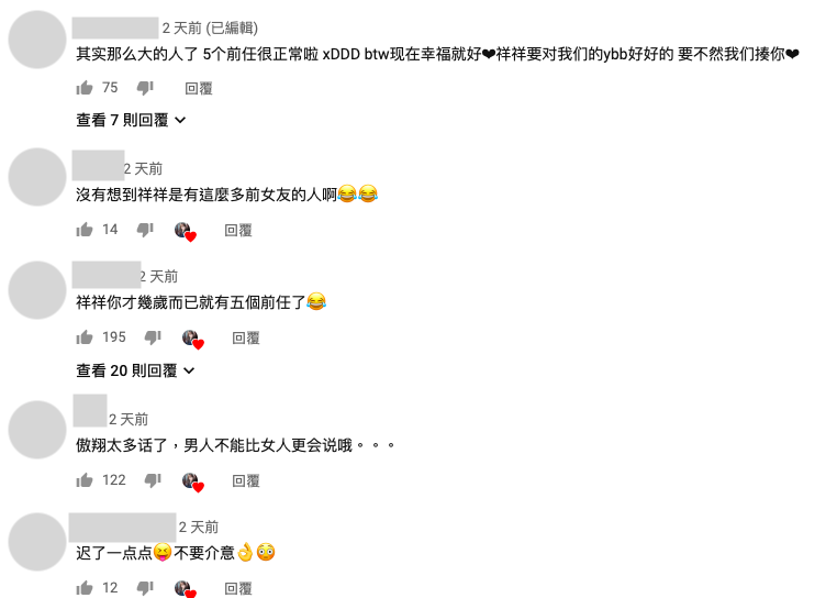 底下留言中,網友對於都對傲祥豐富的感情經歷感到驚訝,紛紛表示:「祥祥才幾歲就有五個前任了!」兩人這段感情因為年齡與名氣的差距,有些網友並不看好,不過從影片看得出兩人互相包容走出風風雨雨,一起經歷成長的模樣。