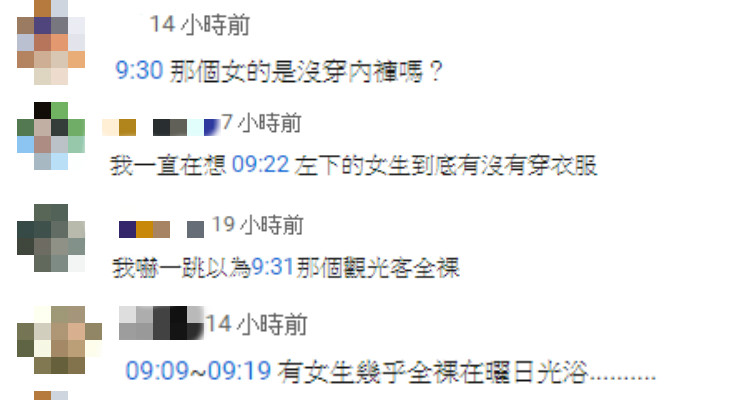 不過仔細一看,其實該名女子有穿著三角泳裝,只是顏色與她的膚色非常相近,才會看不太出來,不過上半身似乎是真的裸體。網友們紛紛笑說:「我嚇一跳,以為那個觀光客全裸」、「是肉色比基尼啦」、「害我看了好幾次!」