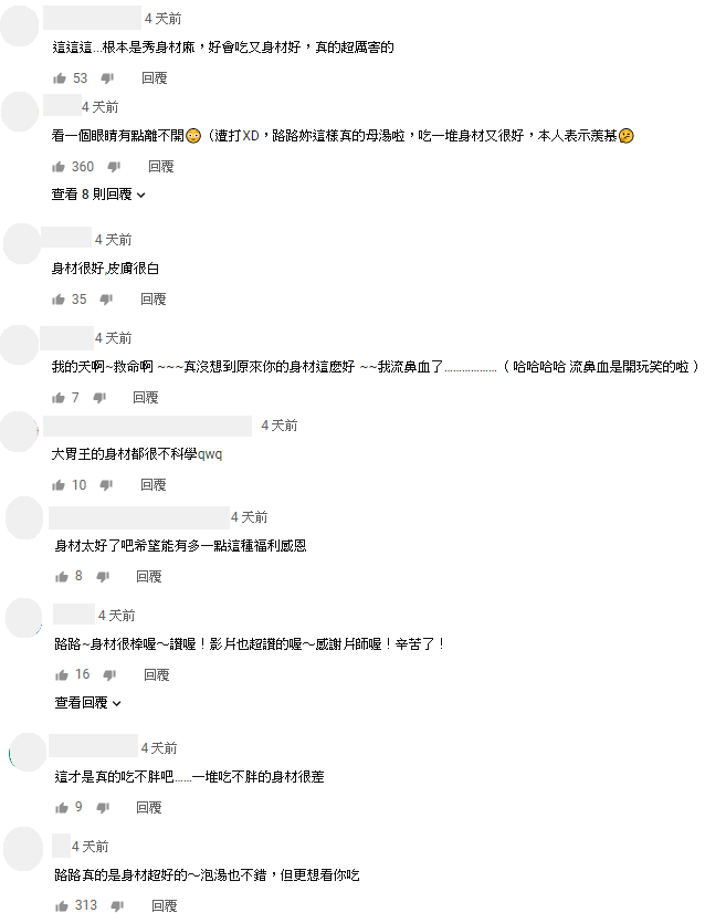 影片上傳之後,網友也紛紛留言:「這這這...根本是秀身材麻,好會吃又身材好,真的超厲害的」、「看一個眼睛有點離不開」、「身材很好,皮膚很白」、「我的天啊~救命啊 ~~~真沒想到原來你的身材這麼好 ~~我流鼻血了」、「大胃王的身材都很不科學qwq」、「身材太好了吧希望能有多一點這種福利感恩」。