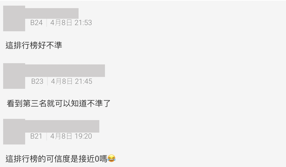 在Dcard上網友們紛紛疑惑此排名居然沒有知名網紅「球球」,過去她在《JustDating》公布的數據中榮獲性幻想女生YouTuber中的第一名,但在這次的排名中卻不見她上榜,也讓網友紛紛直呼:「可信度是0嗎?」