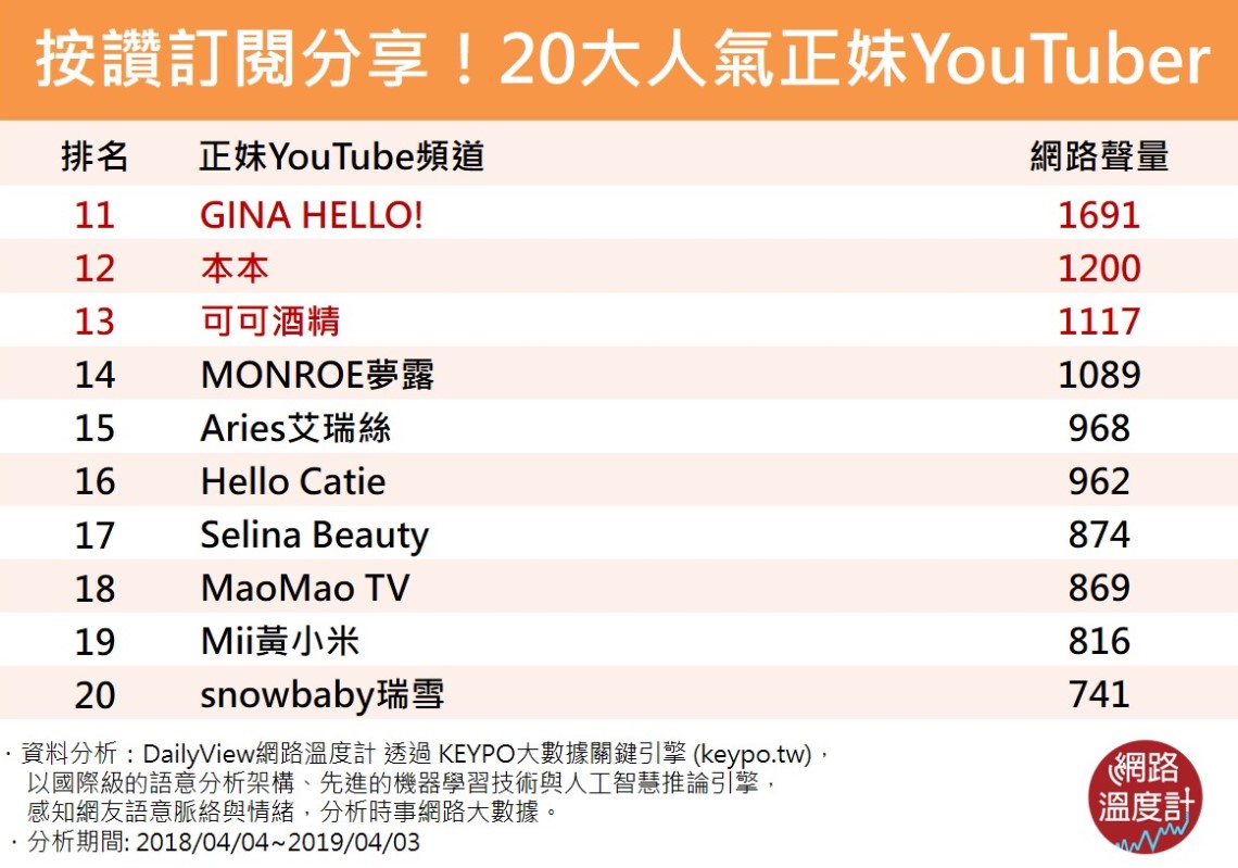 近幾年來越來越多YouTuber們紛紛竄起,在這網紅當道的時代中,許多人都各個身懷絕技,近日在知名網路調查平台《網路溫度計》中,分析並排名出「前20大人氣正妹YouTuber」,此排名也在Dcard上掀起一波討論,然而這排行榜也被網友認為「相當不準」。