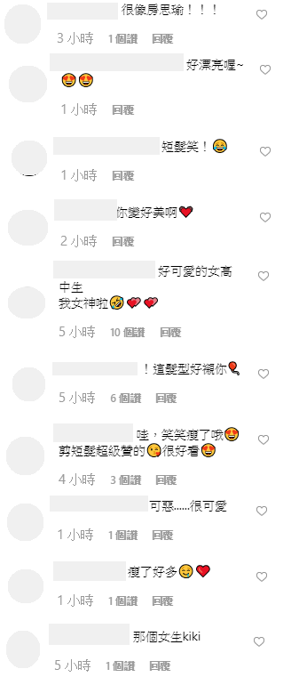 照片上傳之後,許多粉絲也紛紛留言大讚:「笑笑短髮比較好看」、「很像房思瑜!」、「哇~瘦了」、「短髮笑好美」、「剪短髮超級贊的」、「好好看」、「剪頭髮了!一開始認不出來」、「短髮笑好美哦!」、「笑笑也太漂亮」、「短髮好美!」,此外也有人認為有點像YouTuber「那個女生Kiki」。
