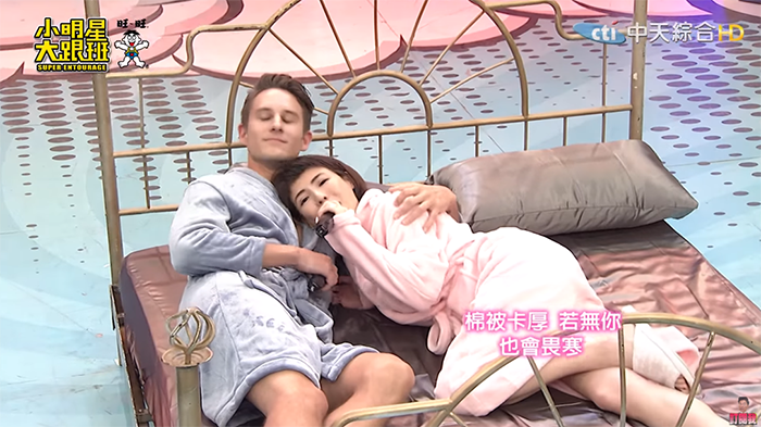 表演過程馬丁躺在床上,小可還將領口微微拉開,兩人躺在床上越靠越近,最後小可甚至躺在馬丁的胸口上。阿Ben面有難色還握著拳頭快看不下去,小可乾脆豁出去,還一邊搔馬丁的胸口,兩人大尺度的互動讓阿Ben簡直崩潰,最後還轉過身乾脆不看,忍不住喊:「太誇張了妳!」讓全場笑翻。