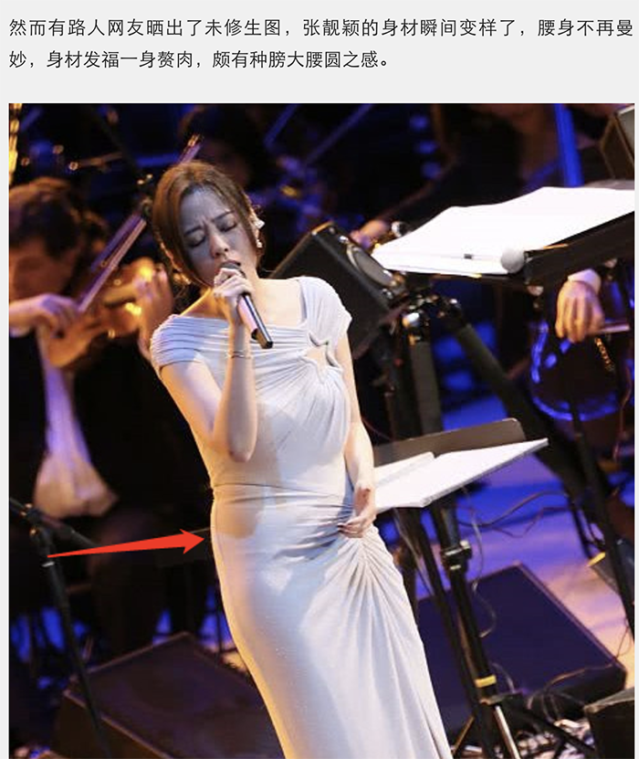 在8號的音樂會中,張靚穎身穿一襲富有設計感的灰色高開叉長裙,展現出高雅的氣質,而她將長髮盤起,僅留下中分的瀏海,極具成熟女性的魅力,而她腳上穿著超高的細跟高跟鞋,拉長了腿部線條,張靚穎工作室的微博上也發出當天演出的照片,此套洋裝凸顯出張靚穎姣好的身材。然而卻有網友在微博上發出當天現場抓拍的照片,該報導更提到:「張靚穎的身材瞬間變樣了,腰身不再曼妙,身材發福一身贅肉,頗有種龐大腰圓之感」,認為張靚穎的身材有些發福走樣。