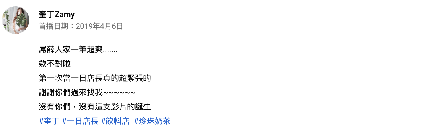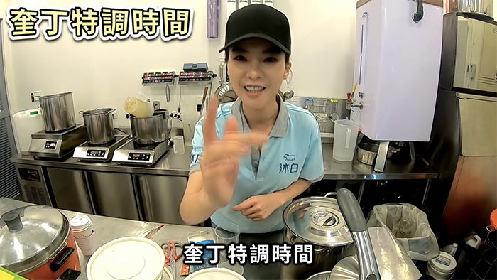近日奎丁前往西門町某家知名飲料店擔任一日店長,在影片一開頭時她也提到今天會製作特調飲料,更稱:「因為我想打破營業額的紀錄」,她也和店長約定好若是突破4萬營業額,要將多出來的金額捐出去。接著奎丁就開始進行前置作業的準備,她也相當幹練的完成了煮茶、煮珍珠、備冰塊的任務,然而開店後她也開始幫客人點餐,展現出相當專業的態度。