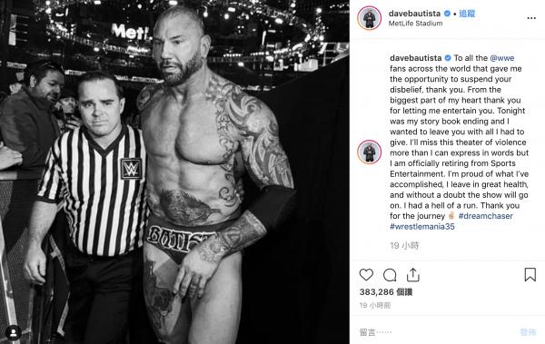 曾經力挺迪士尼開除的《星際異攻隊》(Guardians of the Galaxy)編劇兼導演詹姆斯岡恩(James Gunn)、「毀滅者德克斯」50 歲的摔角選手巴帝斯塔(Batista),今天正式在 IG 宣布正式退休,並感謝一直以來給予支持的 WWE 粉絲們,也宣告他將專心發展演藝事業,朝向專業演員之路發展,粉絲們紛紛給予祝福、不捨這位 WWE 超級巨星離開擂台。