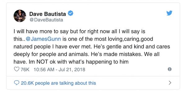▼大砲性格的巴帝斯塔(Batista),先前曾痛批迪士尼開除詹姆斯岡恩(James Gunn)的舉動,巴帝斯塔:「詹姆斯岡恩是我見過的最有愛、體貼、友善的人之一。他溫和,善良,真心地關心每一個人和動物。他是做了錯事,我們都會犯錯,我不能認同現在正發生在他身上的事情。」並揚言要跳槽 DC、追隨詹姆斯岡恩的腳步。