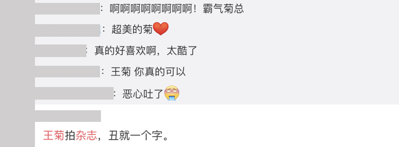 大部分網友認為這些造型相當適合王菊,紛紛留言:「啊啊啊啊啊啊啊啊!霸氣菊總」、「超美的菊」、「真的好喜歡啊,太酷了」、「王菊 你真的可以」,但也有網友認為這造型很怪異,寫下:「王菊拍雜誌,醜就一個字」,出現兩極的評論。去年王菊和同為《創造101》練習生的劉宇珊一起參與錄製騰訊視頻《明星健身房2》節目,而她也大方的在鏡頭前測量體重,其59.4公斤的體重更令她創下該節目最重女嘉賓記錄,她也笑著虧自己「這個記錄會維持很久,到後來都不會有人打破。」,而她的身材也一直是網友相當關注的話題,王菊也開始健身開始雕塑自己的體態。