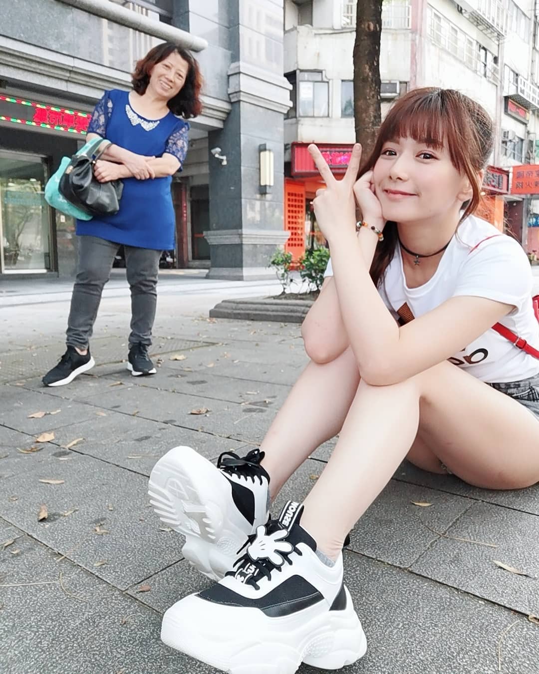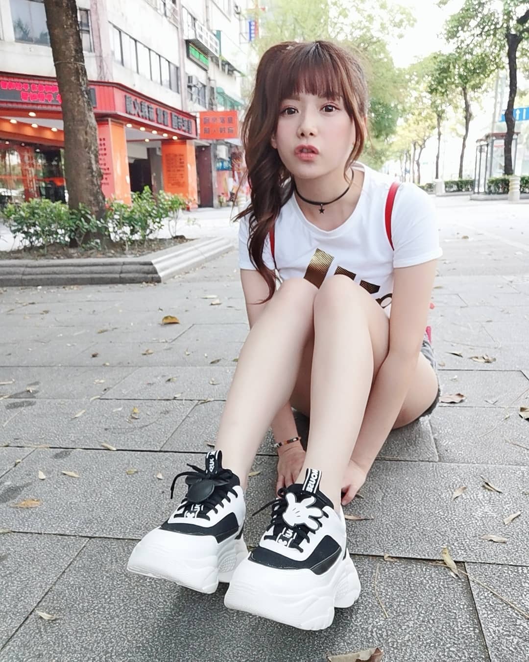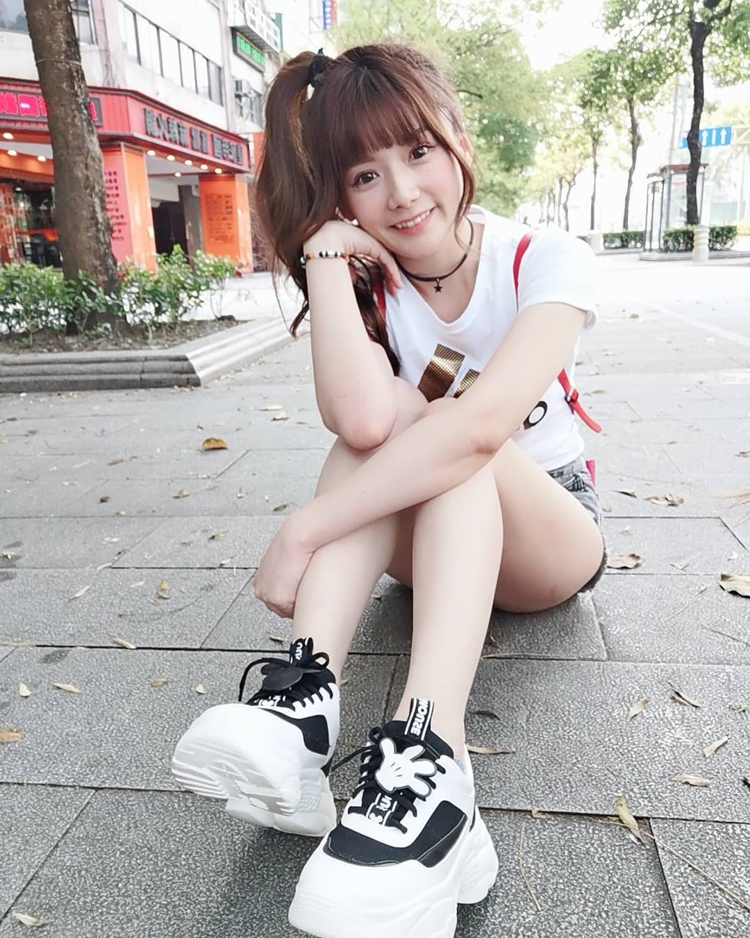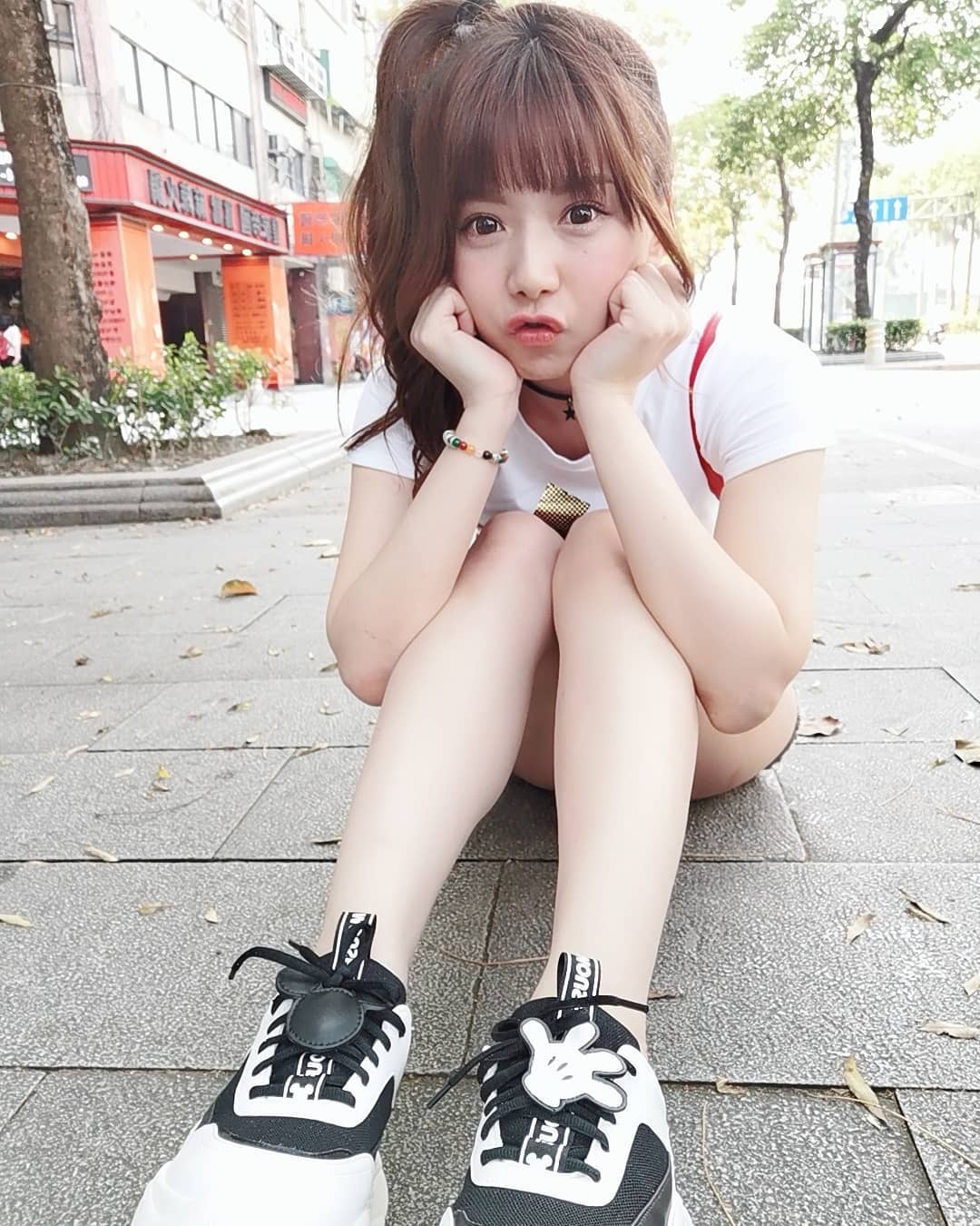 只不過她的短褲原本就很短,坐在人行道的磁磚上拍照,整個屁股蛋露在外面,白皙的大長腿也一覽無遺,粉絲們激動說:「那地磚我買了」、「褲子太短了啦!」、「好想當地板」。