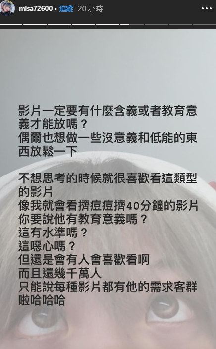 影片上傳之後,也被YouTube歸為「設有年齡限制的影片」,而後來米砂也在自己的IG中發文,「影片一定要有什麼含意或者教育意義才能放嗎?」,米砂表示自己偶爾也想做一些沒意義和低能的東西放鬆,「不想思考的時候就很喜歡看這類型的影片」,更舉例自己很喜歡擠痘痘的影片,「有教育意義嗎?有水準嗎?這噁心嗎?」,提出不同類型的影片都會有人喜歡看,因為客群不一樣。