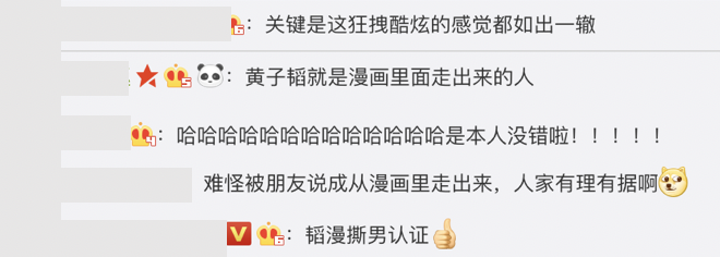 黃子韜因帥氣的外型,過去被網友認為是撕破漫畫走出來的美男子,封為「撕漫男」,也常被粉絲畫成漫畫肖像。這次撞臉《名偵探柯南》角色,讓網友紛紛留言:「難怪被朋友說成從漫畫里走出來,人家有理有據啊」、「韜漫撕男認證」、「關鍵是這狂拽酷炫的感覺都如出一轍」、「哈哈哈哈哈哈哈哈哈哈哈哈哈是本人沒錯啦!」、「黃子韜就是漫畫裡面走出來的人」,讓粉絲都笑翻了。