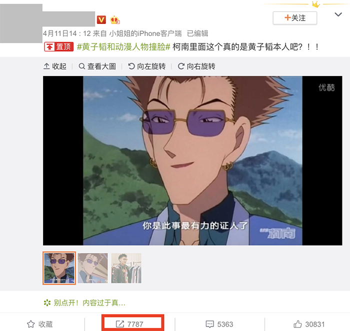 近日在微博上有位網友發出一張日本知名動漫《名偵探柯南》的角色截圖,並寫下:「柯南裡面這個真的是黃子韜本人吧?!!」,該名網友截圖了《名偵探柯南》其中一集登場的男子,延續動畫固定的畫風,該角色有個V字臉並戴著墨鏡、耳環、髮型朝天頭,相當時尚,就有網友將黃子韜類似的穿搭風格和該角色進行對比,該則貼文也湧入將近8000人轉發,照片在微博上瘋傳。