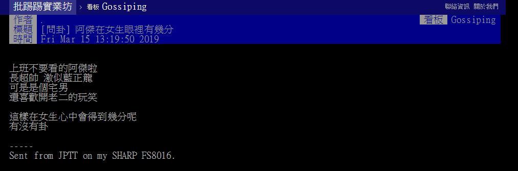 在3月時,有PTT鄉民在八卦版上詢問「阿傑在女生眼裡有幾分?」,原PO表示阿傑模樣帥氣,不過其實是個宅男,平時還會開黃腔,想知道廣大鄉民會怎麼評價,而這篇文章立刻引起了正反兩方論戰,而阿傑本人也在IG上親自回應:「記得我面試進去上班不要看,我對呱吉說頻道不該都是屎尿雞雞的應該要來點新的玩意吧」,更表示「很多企劃不談,結果大家只記得XX,然後笑很爽啊,這不就上班不要看嗎?」,霸氣的言論也獲得許多網友支持。