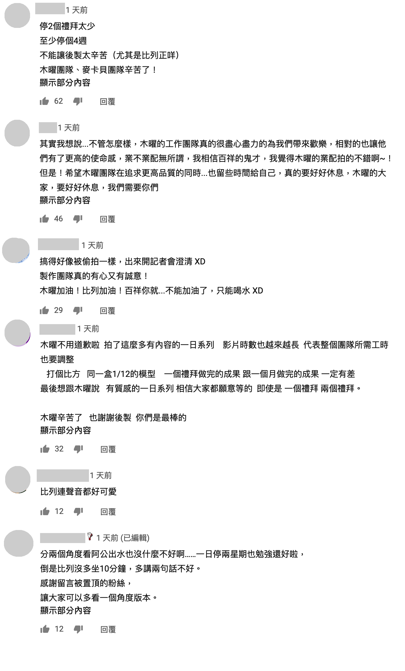 百祥表示「木曜4」即將迎來100集,屆時也會推出馬拉松活動,讓大家看看木曜最真實的一面,而他這次和粉絲道歉,粉絲也紛紛暖心留言:「停2個禮拜太少 至少停個4週 不能讓後製太辛苦」、「真的要好好休息,木曜的大家,要好好休息,我們需要你們」、「製作團隊真的有心又有誠意!」、「百祥及木曜團隊所有人都辛苦了」、「質感的一日系列 相信大家都願意等的」。