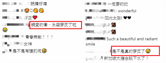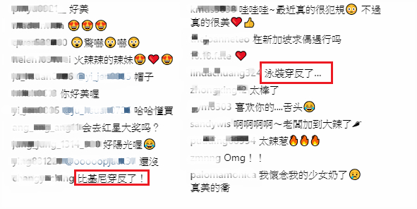 不過照片一曝光,有眼尖網友發現曾之喬比基尼綁帶位置,似乎些許奇怪,許多網友看完紛紛驚呼提醒:「親愛的喬,泳裝穿反了啦」、「是不是真的穿反了!」目前曾之喬尚未回應是否真的「穿反」,其他網友則頻頻大讚「這身材也太好了吧!」就連女星「鬼鬼」吳映潔也留言表示:「太辣!你是小辣椒」。
