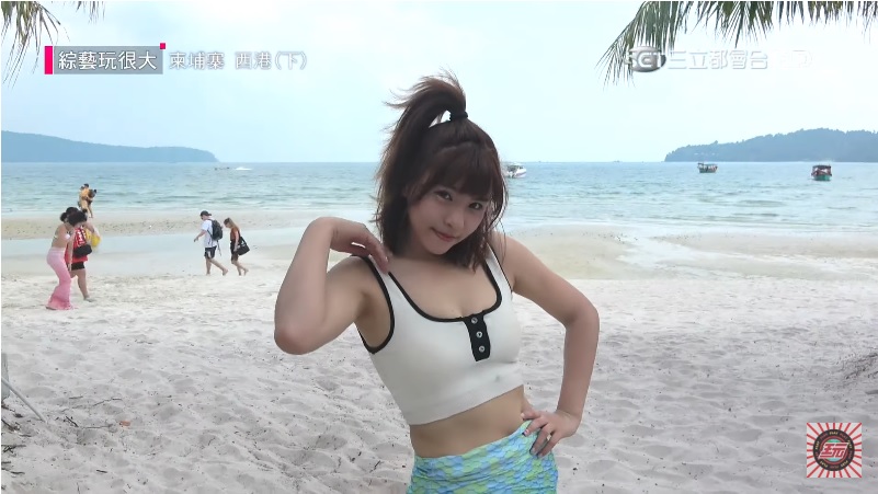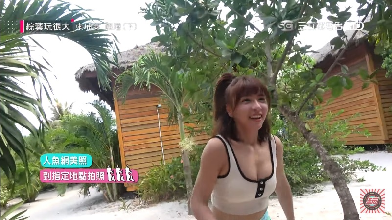 《玩很大》其中一道關卡為,兩隊分別在沙灘上找出指定任務完成即可過關,藝人們在沙灘上拚命找尋自己名字的任務球,峮峮任務需要化身成「美人魚」,到三個指定地點請遊客幫忙拍照才算完成,她穿著白色低胸無袖上衣,加上「美人魚裝尾巴」,寸步難行的她,仍快跑前往目的地。