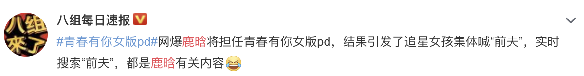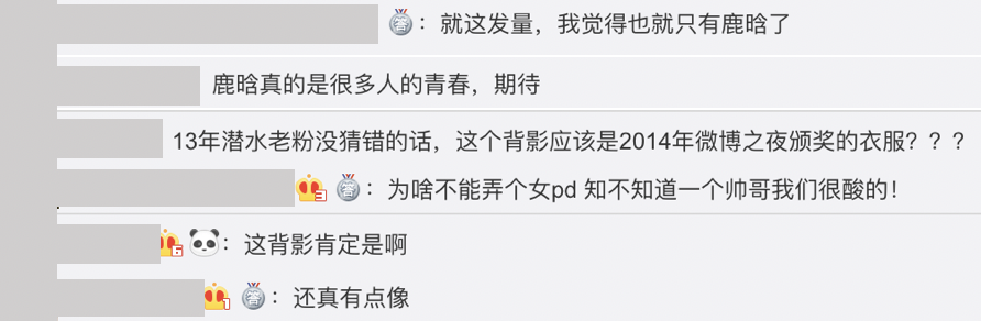 昨日晚間多位知名娛樂博主爆出一張《青春有你》女生版PD的背影照,該張海報中更寫下:「誰是青春製作人代表」,其中該背影照也被網友翻出很像鹿晗的背影,該名博主更寫下:「引發了追星女孩集體喊『前夫』,實時搜索『前夫』,都是鹿晗有關內容」,然而網友對於此爆料消息紛紛留言:「為啥不能弄個女pd」、「13年潛水老粉沒猜錯的話,這個背影應該是2014年微博之夜頒獎的衣服???」、「鹿晗真的是很多人的青春,期待」、「就這發量,我覺得也就只有鹿晗了」