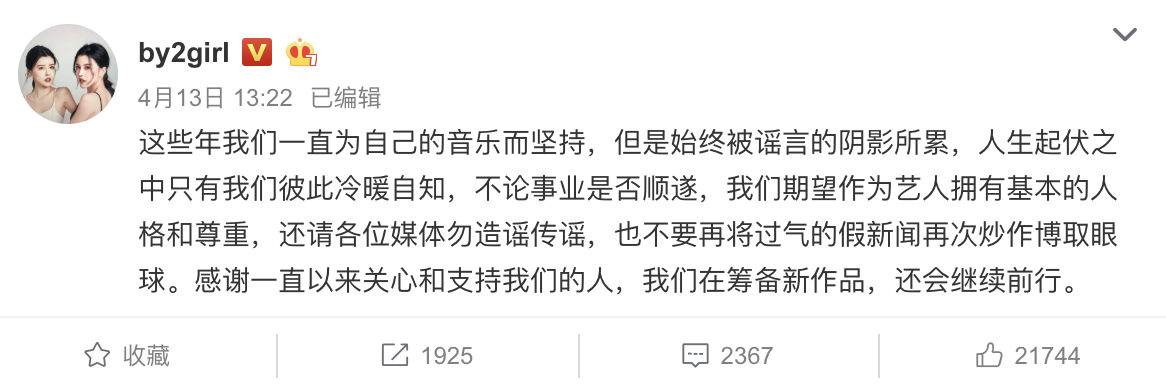 然而BY2也透過官方微博發出聲明:「這些年我們一直為自己的音樂而堅持,但是始終被謠言的陰影所累,人生起伏之中只有我們彼此冷暖自知,不論事業是否順遂,我們期望作為藝人擁有基本的人格和尊重」,並且請各位媒體勿造謠傳謠,也不要再將過氣的假新聞再次炒作博取眼球,更提到兩姐妹目前正在籌備新專輯。