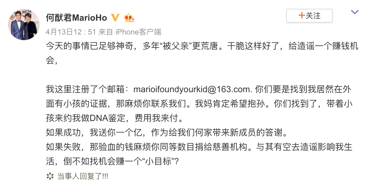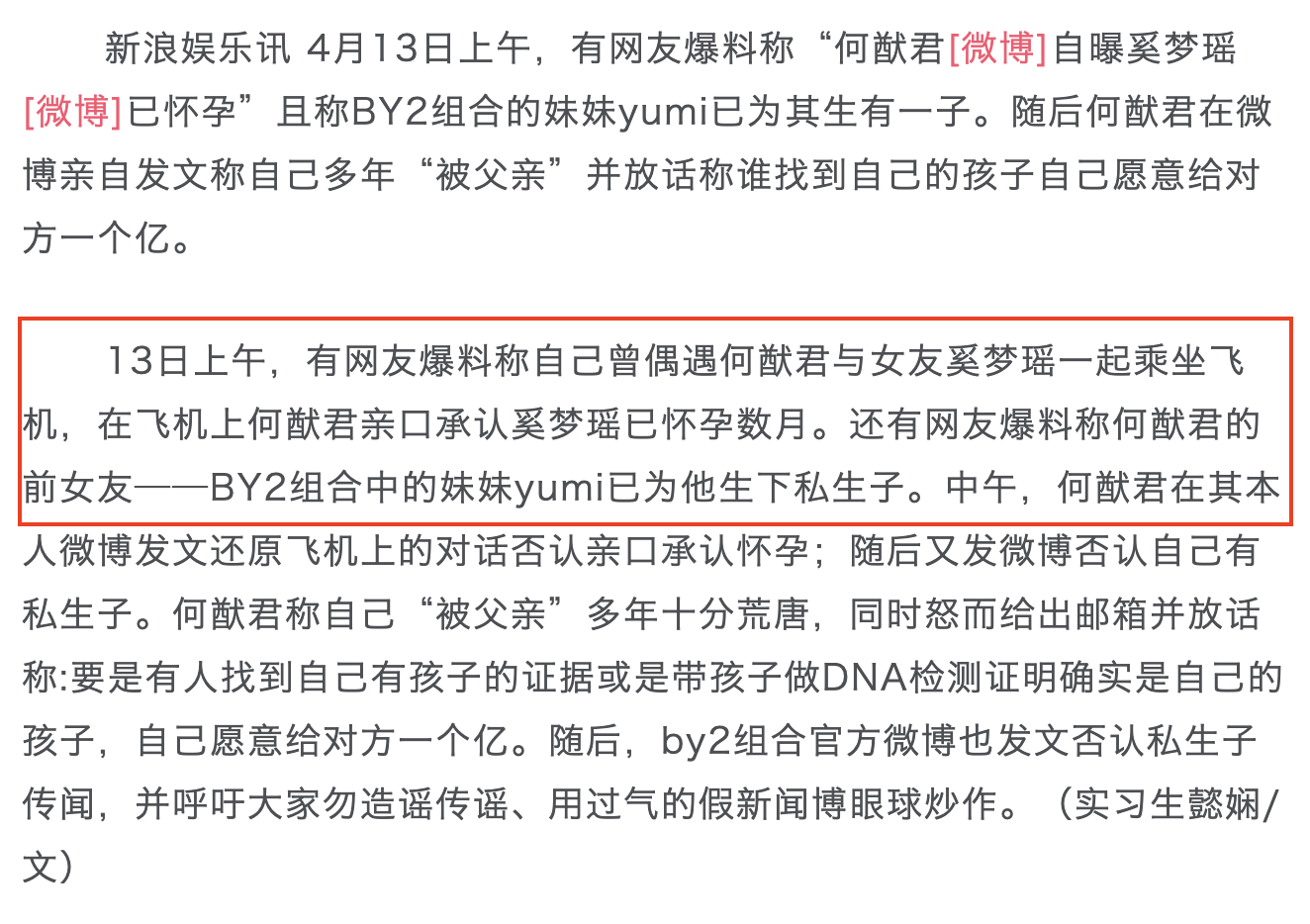 根據陸媒新浪娛樂報導指出,13日上午有網友爆料稱自己曾偶遇何猷君與女友奚夢瑤一起乘坐飛機,在飛機上何猷君親口承認奚夢瑤已懷孕數月,接著更有網友爆料稱何猷君的前女友—BY2組合中的妹妹yumi已為他生下私生子。然而何猷君在13日時發文還原當時在飛機上和空姐的對話內容,接著他再度發布一則貼文:「今天的事情已足夠神奇,多年『被父親』更荒唐。乾脆這樣好了,給造謠一個賺錢機會,我這裡註冊了個郵箱:[email protected]. 你們要是找到我居然在外面有小孩的證據,那麻煩你聯繫我們。」,直接否認生子傳聞。