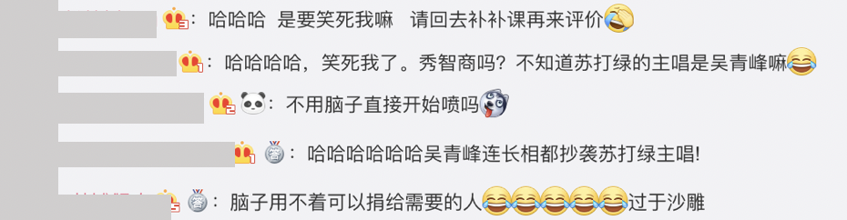 而網友看見如此搞笑、天兵的彈幕留言後,紛紛在底下表示:「腦子用不著可以捐給需要的人」、「哈哈哈吳青峰連長相都抄襲蘇打綠主唱!」、「不用腦子直接開始噴嗎」、「哈哈哈哈,笑死我了。秀智商嗎?」、「哈哈哈 是要笑死我嘛 請回去補補課再來評價」、「這是今天看過最好笑的笑話」。《歌頌者》這首歌也同步在吳青峰的YouTube頻道更新,他也寫下:「我是帶著我的創作來到這個舞台的,我也希望我是唱著我的作品離開這個舞台,所以我把這樣的心情寫成了一首歌,我現在還可以很不帶偏見地覺得來這一趟非常非常值得」,歌詞句句唱進聽眾心坎。
