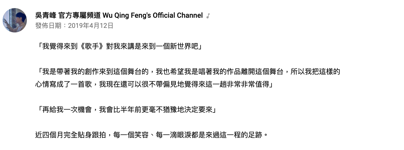1月開播的大陸歌唱節目《歌手2019》受到兩岸三地的關注,在12日也進行最終的總決賽直播,各個參賽者都邀請到非常大咖的歌手前來幫唱助陣,其中冠軍呼聲相當高的選手「吳青峰」,邀請到天后蔡依林一同合作。而在第二輪競演中,吳青峰演唱自創歌曲《歌頌者》,然而在聽歌時有網友透過彈幕批評「吳青峰這首歌抄蘇打綠」,引發網友一陣爆笑。