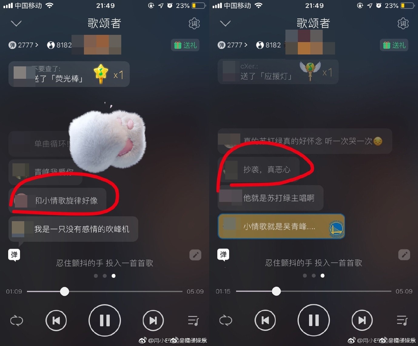 12日節目總決賽時,吳青峰第二輪競演演唱自創歌曲《歌頌者》,這首歌融入了蘇打綠經典歌曲《小情歌》的歌詞,唱出青峰一路上的心路歷程,然而在聽歌時有網友透過彈幕批評「吳青峰這首歌抄蘇打綠」、「有點小情歌的旋律呢」、「抄襲真噁心」、「和小情歌的旋律好像」,有網友將這些截圖PO上微博,引發上萬人前來評論,且瞬間登上熱搜。