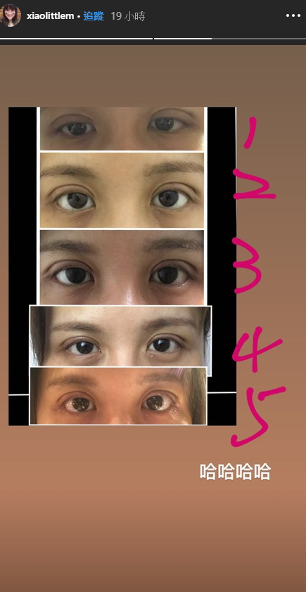 蕭小M近日在IG及臉書中公開縫雙眼皮的照片,只見她貼上手術後第一天到第五天的對比照,在第一天的照片中,眼睛還明顯腫脹,不過隨著天數也越來越消腫,到了第五天也變得十分自然!而「小M」14日時,也在臉書中分享自己化完妝的樣子,雖然僅畫了淡妝,不過氣色仍相當好,她也對著鏡頭燦笑,並表示照片中的她正好是縫完雙眼皮的第四天。
