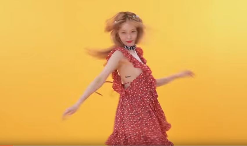 韓國女星泫雅加入新東家「P Nation」雖然還未回歸韓國樂壇,不過到是接下不少時尚雜誌的平面拍攝,7日,為美妝品牌「STYLENANDA」拍攝的宣傳廣告也在官方YT播出,尺度十分大膽。廣告才開始沒多久,泫雅就身穿紅色碎花短洋裝亮相,不時隨著歌曲搖擺,轉向側身時,洋裝兩邊低口的設計更是讓右邊胸部若隱若現,畫面十分驚悚。