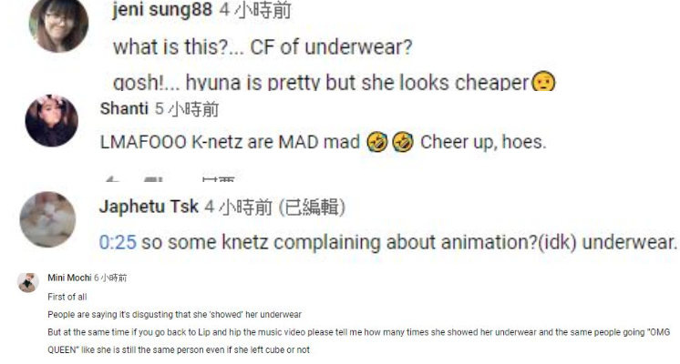 而在影片末端,泫雅則換上豹紋細肩帶的窄版洋裝,這時他的眼神也隨著服裝風格轉換變得相當性感,不過就在準備換下一套服裝時,突然掀起裙子豪放露出底褲,廣告中雖有後至上橘色內褲的圖樣,不過畫面一出仍引起網友熱烈討論,並紛紛說到「這是什麼?內褲廣告嗎?泫雅明明很美為什麼要把自己搞得這麼廉價」,另也有網友認為過去泫雅在2017年推出的歌曲《Lip and hip》MV中,也有同樣掀內衣的畫面並說到「那時候你們說她性感現在為什麼就覺得噁心了呢」。